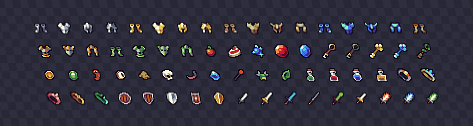 This pack contains every items needed for the Tiny Dungeons asset pack, exported separately as well as an atlas.. I also procedurally generated rotating animations for each item, each has his own spritesheet. It will be updated as new content is created for the pack.